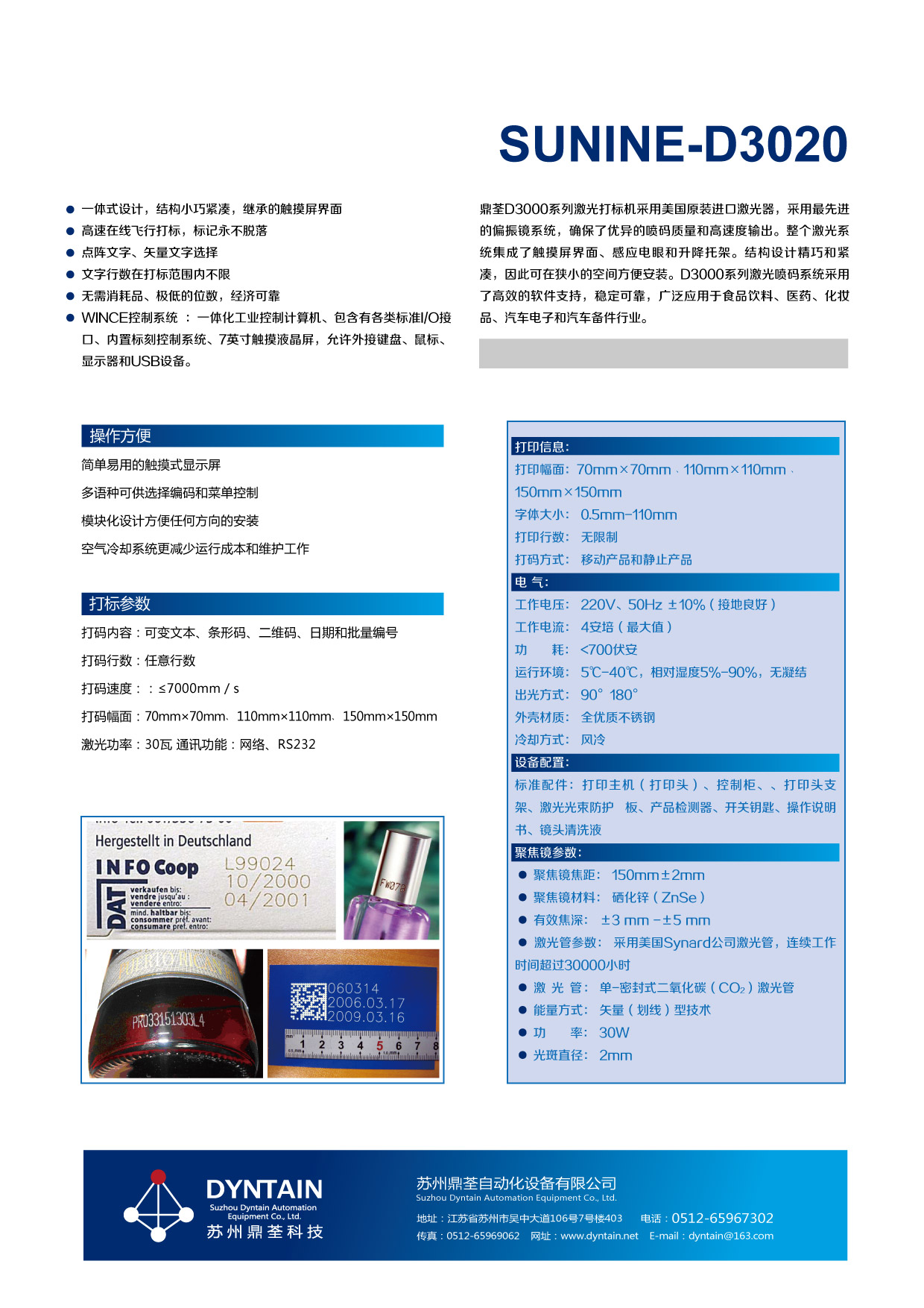 鼎荃D3000系列激光打標機采用美國原裝進口激光器,采用最先進的偏振鏡系統,確保了優(yōu)異的噴碼質量和高速度輸出。整個激光系統集成了觸摸屏界面、感應電眼和升降托架。結構設計精 咨詢熱線:051265969062 15862538359(手機號/微信同號)